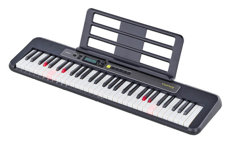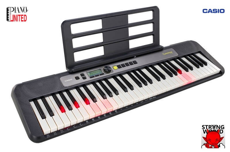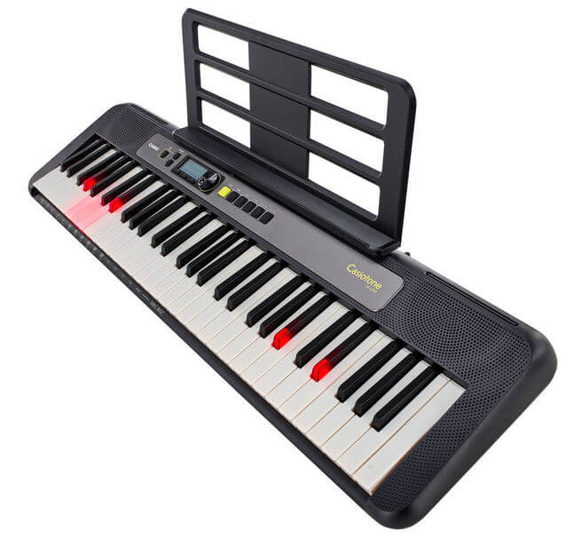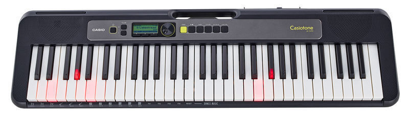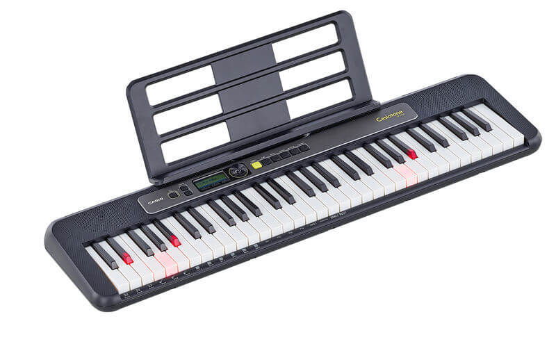 When a song is played, the light-up keyboard shows the left-hand part and the melody. The notes and chords for the melody are shown on the keyboard's LCD.