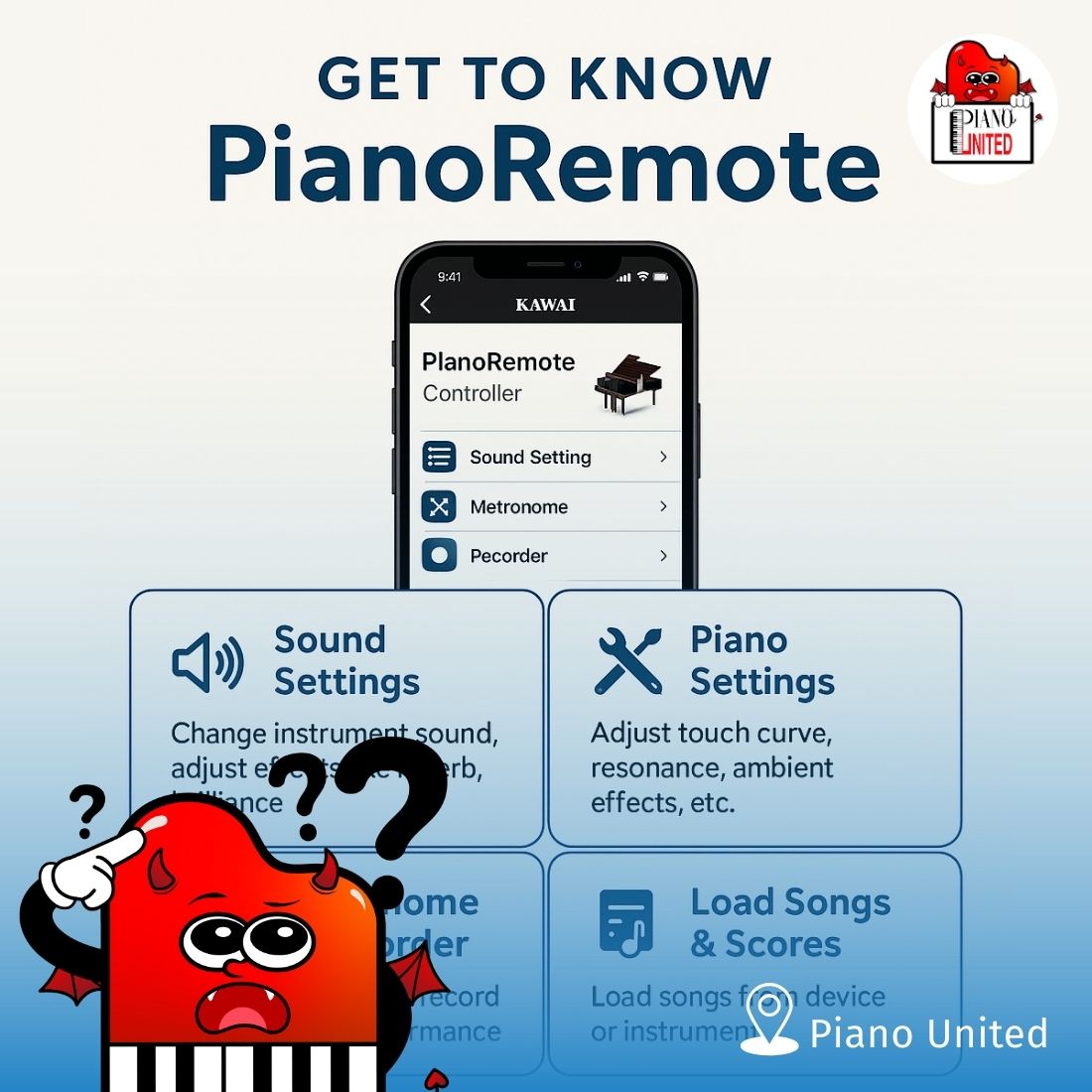 แอป Piano Remote Controller เป็นแอปพลิเคชันที่พัฒนาโดย Kawai ซึ่งเป็นบริษัทผลิตเปียโนและคีย์บอร์ดดิจิทัลชื่อดังจากญี่ปุ่น แอปนี้ออกแบบมาเพื่อให้ผู้ใช้สามารถควบคุมการตั้งค่าต่างๆ ของเปียโนดิจิทัลของ Kawai ได้อย่างง่ายดายผ่านสมาร์ตโฟนหรือแท็บเล็ต โดยเชื่อมต่อผ่าน Bluetooth หรือสาย USB