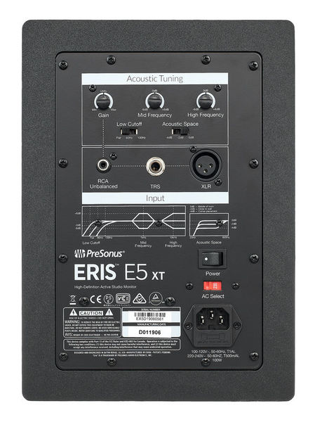 We know modern recording studios can be anywhere from a spare bedroom to a multi-million dollar facility; that’s why every studio monitor we make is equipped with controls that ensure the flattest response in your mix environment. Acoustic tuning controls allow you to configure the Eris E5 XT perfectly for your room—you get Low-cut, Mid, and High controls, as well as 3-way acoustic space tuning that allows you to easily compensate for the sonic consequences of speaker placement against a wall or in a corner.